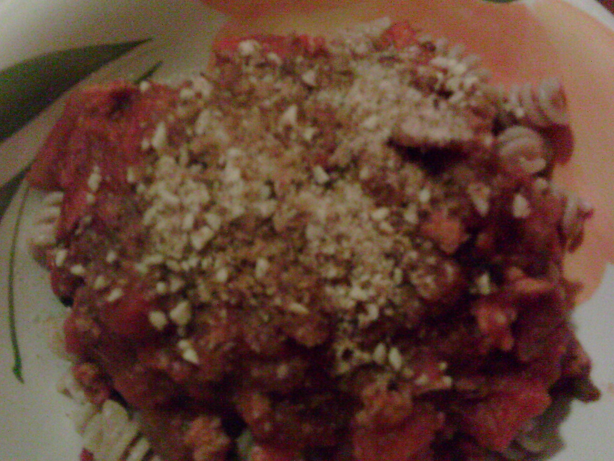 D’abord, une entrée typique de la cuisine de l’est (je viens de Lorraine) avec du chou rouge cuit au jus de pomme, et pour la première fois du simili-carné en plat avec un ragù végétal. Du rapide et efficace.