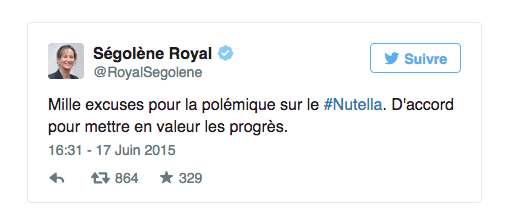 Enfin, pour ceux que les circonvolutions et les renoncements politico-diplomatiques amusent, sachez que depuis trois jours, la Ministre rétropédale sur le boycott du Nutella et à déjà présenté ses plus plates excuses au gouvernement italien (Nutella est produit par Ferrero, marque italienne).