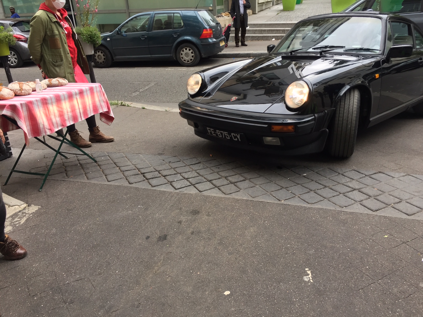 Pour le fun, je vous joins une photo-souvenir de la sortie d’une porsche, un soir de distribution, au 40 rue de la Réunion, qui nous a obligé en catastrophe a libérer le passage… Heureusement ce 10 juin, nous avions encore des légumes en sac et pas les gros cageots à bouger…