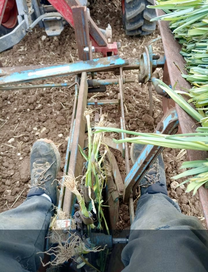 On maîtrise de mieux en mieux la planteuse à poireaux. Des douleurs dans le dos et les doigts mais la plantation de 11000 poireaux plantés en 11h s’est bien passée. 7 variétés différentes pour étaler les récoltes de septembre à avril, plantées plus profondément pour obtenir des grands et longs fûts blancs.