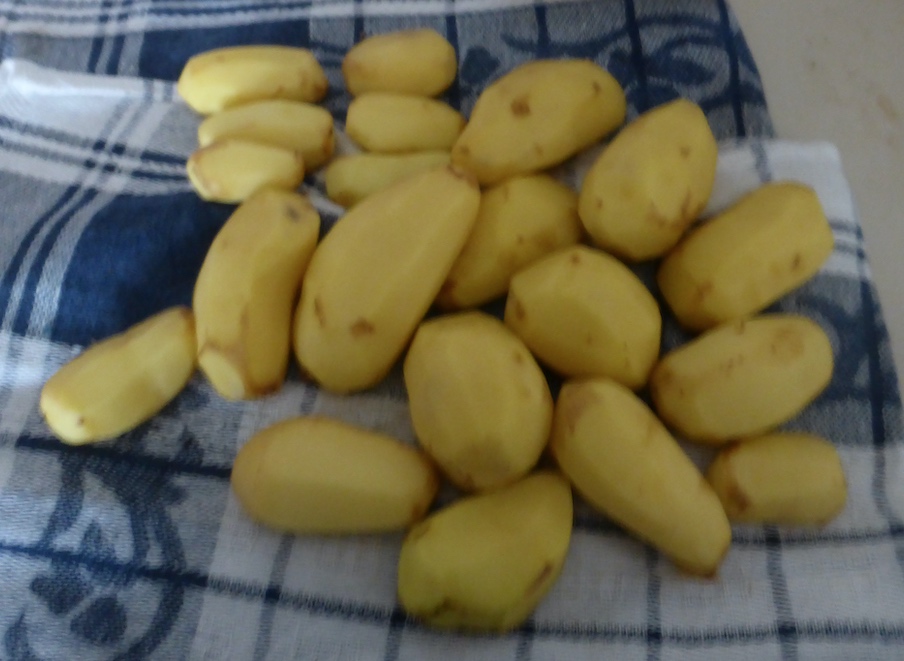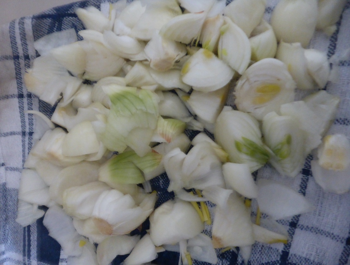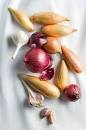 - Épluchez l’ail et l’oignon et émincez-les grossièrement. Épluchez la pomme de terre et coupez-la en gros morceaux.