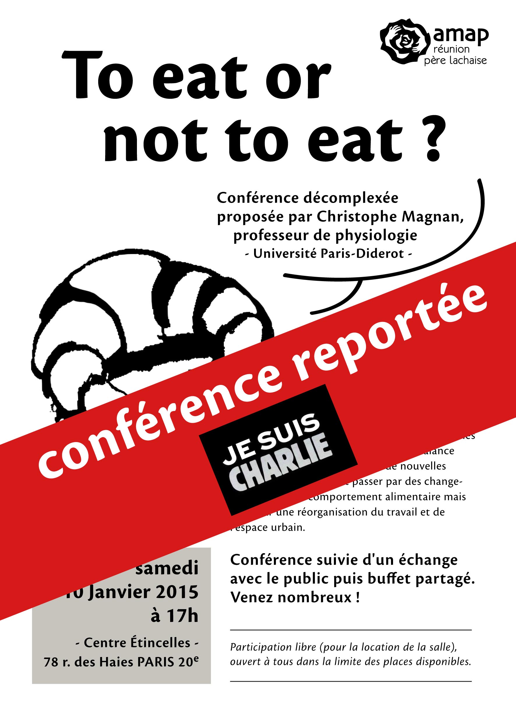 CONFÉRENCE REPORTÉE ! 9 janvier 20159 janvier 2015AMAP-RPL Poster un commentaire En raison des événements actuels, la conférence « To eat or not to eat », initialement prévue ce samedi, est reportée. Nous vous informerons rapidement de la nouvelle date envisagée. Merci de votre compréhension.