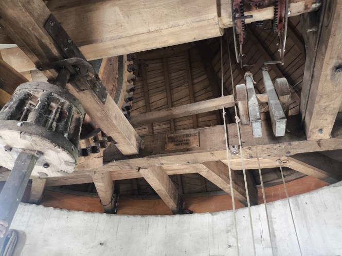 Les ailes ne sont pas entoilées mais équipées du système « Berton », système de planchettes qui permet de régler facilement la surface de voilure depuis le troisième étage du moulin. Celui par lequel on commence la visite.