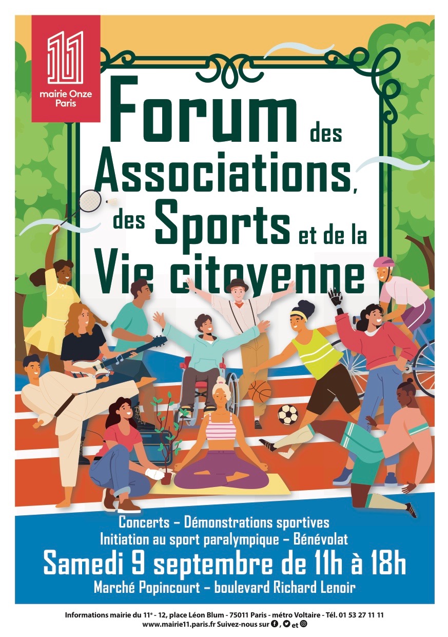 Le forum constitue la vitrine de l’engagement et de la diversité associative locale. Démonstrations, animations et stands d’informations pour tout savoir sur les activités proposées dans le 11e réparties selon les thèmes : Arts et loisirs, Environnement & climat, Santé & handicap, Solidarité, Vie locale et citoyenne.